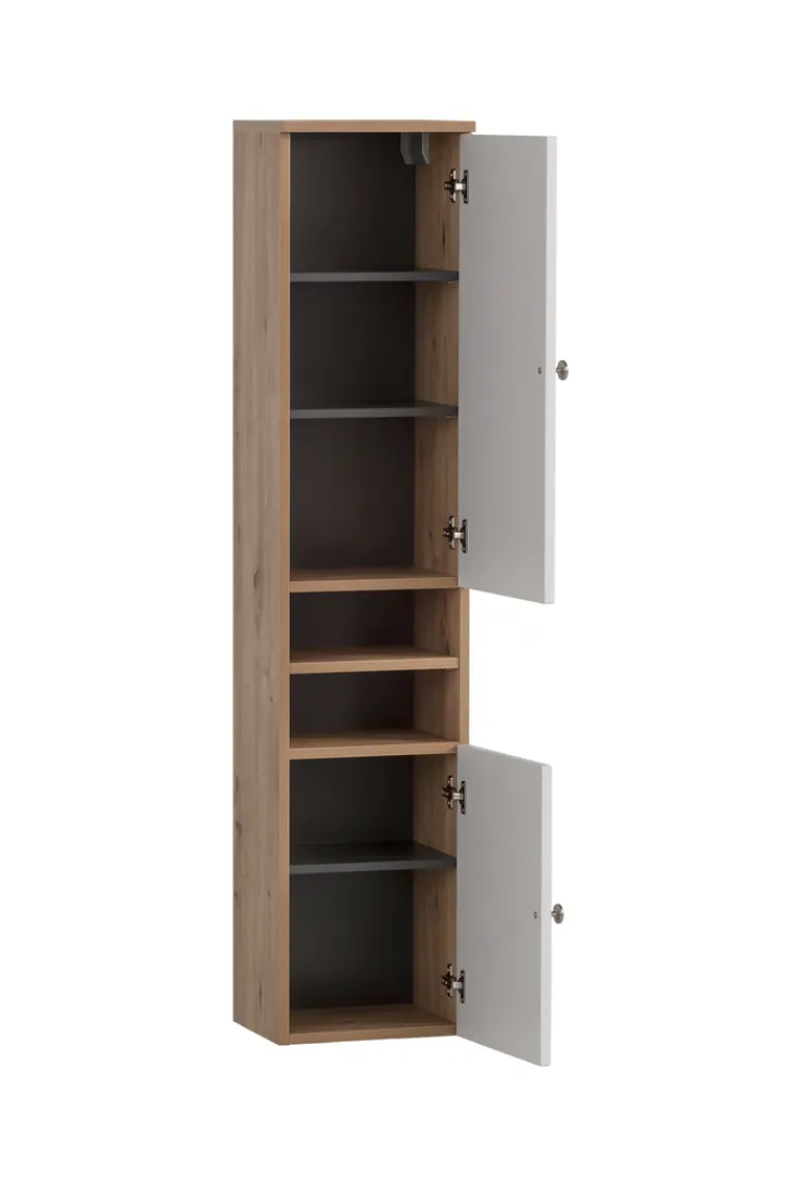 Die Griffe und Beschläge bestehen aus robustem Metall und die Artisan Eiche Dekorverkleidung weist eine fühlbare Holzstruktur auf. Der Bad-Hochschrank JESPER verfügt über großzügigen Stauraum mit zwei Türen. Drei höhenverstellbare Einlegeböden schaffen flexible Aufbewahrungsmöglichkeiten für Badaccessoires wie Handtücher, Waschutensilien und Reinigungsmittel. Zusätzlich gibt es zwei offene Regalfächer für den schnellen Zugriff auf oft benötigte Artikel. Mit seiner hängenden Montage spart der Schrank Platz und fügt sich harmonisch in jedes Badezimmer im Landhausstil ein.