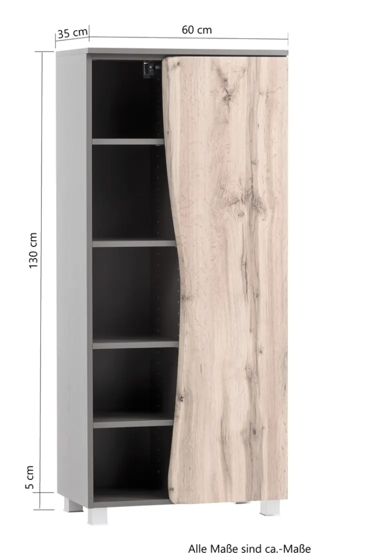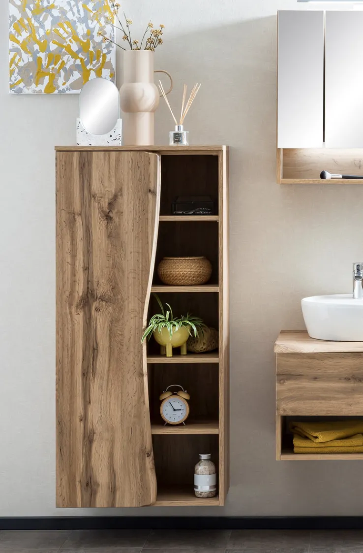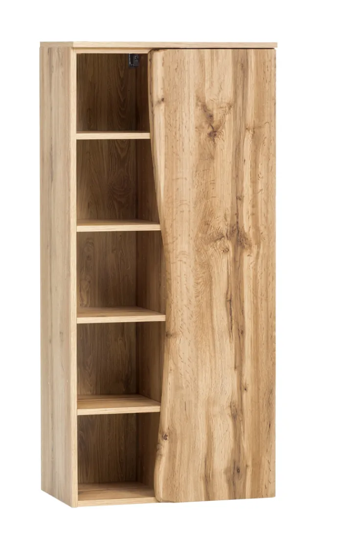 Das Bad-Midiregal ANTWERPEN in Braun mit einer Breite von 60 cm, einer Höhe von 130 cm und einer Tiefe von 35 cm präsentiert sich als praktische und stilvolle Lösung für zusätzlichen Stauraum im Badezimmer. Die helle Wotaneiche-Nachbildung verleiht dem Regal eine warme und natürliche Ausstrahlung, während die Baumstammkante an der Tür für eine rustikale Note sorgt. Das Regal ist mit einer Tür und insgesamt 8 Einlegeböden ausgestattet, die vielfältige Möglichkeiten zur Aufbewahrung von Badutensilien bieten. Die 4 Möbelfüße sorgen für eine stabile und standfeste Positionierung des Regals.