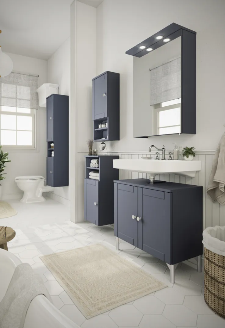 Der Unterschrank für das Bad präsentiert sich in einem modernen Design und überzeugt durch seine funktionalen Eigenschaften. Mit einer Breite von 30,3 cm, einer Höhe von 70 cm und einer Tiefe von 25,4 cm bietet er ausreichend Stauraum für diverse Badutensilien. Der Schrank ist in einem eleganten Nachtblau gehalten, das dem Raum eine stilvolle Note verleiht. Die Holznachbildung sorgt für eine robuste und pflegeleichte Oberfläche.