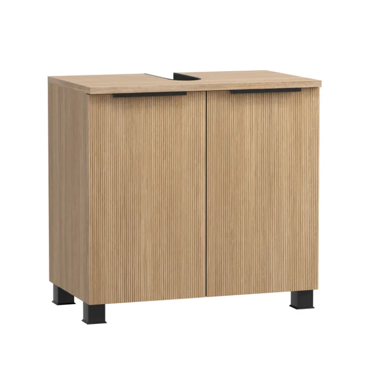Dank der praktischen Ablageflächen und des großzügigen Stauraums ist dieser Waschbeckenunterschrank nicht nur funktional, sondern auch ein ästhetisches Highlight in jedem Badezimmer. Die stabilen schwarzen Füße sorgen für einen sicheren Stand und runden das Gesamtbild harmonisch ab.