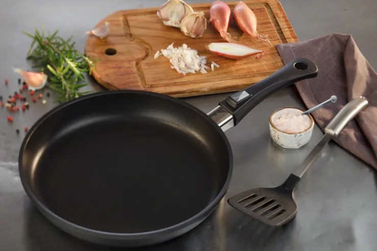 Die 1,4 Kilogramm schwere Pfanne aus Metall steht sicher auf jedem Herd. Nach dem Abnehmen des Griffs kann das Modell zum Servieren auf dem Tisch auf einem feuerfesten Untersetzer verwendet werden. Die Antihaftbeschichtung sorgt für eine mühelose Reinigung nach dem Braten. Der hochmodern Boden verteilt die Wärme der Herdplatte gleichmäßig in der gesamten Pfanne.