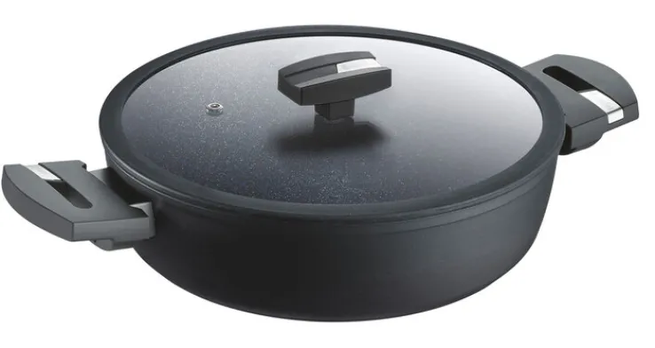 BALANCE® INDUCTION ENDURO heißt die Servierpfanne von der Marke Berndes. Er hat einen Durchmesser von 28 cm und zeigt sich in schwarzem Alu. Auch designtechnisch zieht Berndes alle Register. Die massive Optik wirkt äußerst edel, zeitlos und schlicht. Dadurch kann die Pfanne vielseitig zu verschiedenen Küchenlinien kombiniert werden. Er hat ein Fassungsvermögen von 4 Litern.