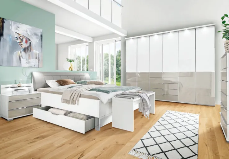 Das gepolsterte Kopfteil des Betts erscheint im Lederlook. Die Nachtschränke stehen auf Flachfüßen und besitzen jeweils drei Schubkästen für Lesebrille, Buch & Co. Bei den hochwertigen Materialien hat Holznachbildung und Glas verwendet.