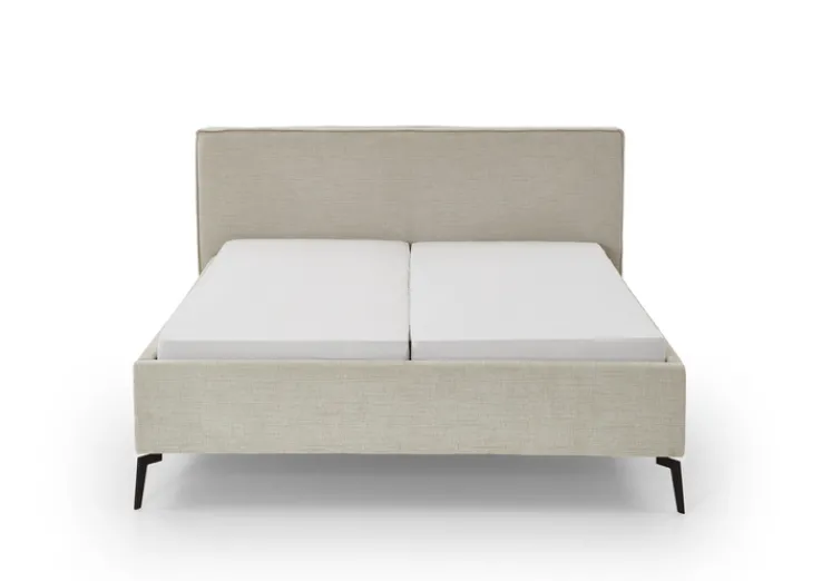 Das Bettgestell RIVA mit beigem Überzug aus abriebfestem Webstoff kann mit allen herkömmlichen Matratzen und Lattenrosten der gleichen Abmessungen bestückt werden. Durch die schwarz pulverbeschichteten Metallfüße wirkt es leicht, ist allerdings von zwei Personen hoch belastbar. Insgesamt wiegen das gepolsterte Gestell und die schmalen Füße 72 kg. Schmutz setzt sich durch die grobe Webart kaum fest. Zur Reinigung kann der Webstoff bei Bedarf abgesaugt und gelegentlich abgedämpft werden.