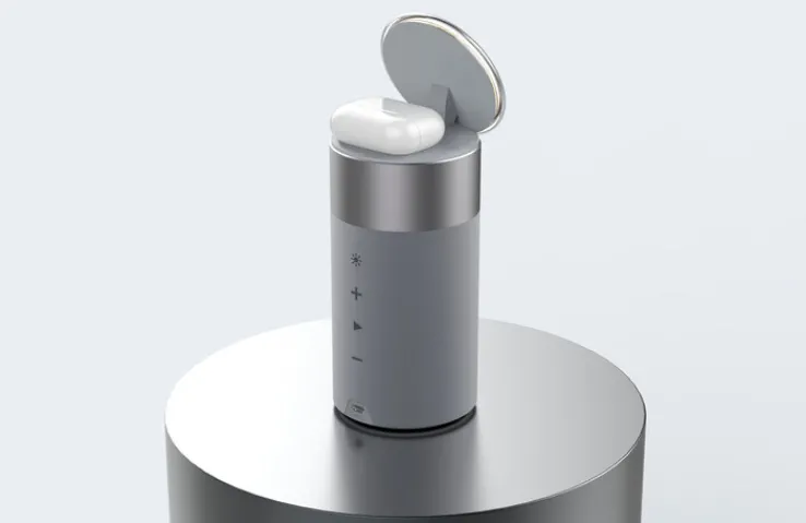 Der in Grau gehaltene Bluetooth-Lautsprecher mit Ladefunktion und Nachtlicht erfreut nicht nur Augen und Ohren, sondern glänzt auch anderweitig.