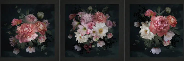 Dieses Set aus drei Kunstdrucken bringt die Schönheit der Natur in Ihr Zuhause. Jeder Druck zeigt ein kunstvoll arrangiertes Blumenmotiv in lebendigen, mehrfarbigen Tönen, die auf einem dunklen Hintergrund besonders gut zur Geltung kommen. Die floralen Designs sind modern und verleihen jedem Raum eine elegante Note. Die rechteckigen Bilder haben jeweils eine Größe von 23 cm x 23 cm und eine Tiefe von 2,1 cm, was sie ideal für eine harmonische Wanddekoration macht.