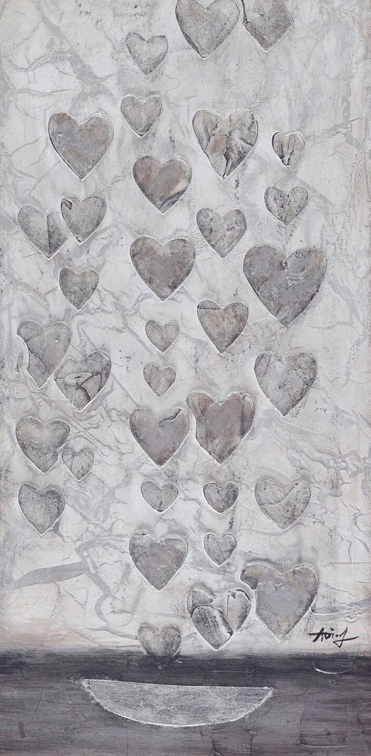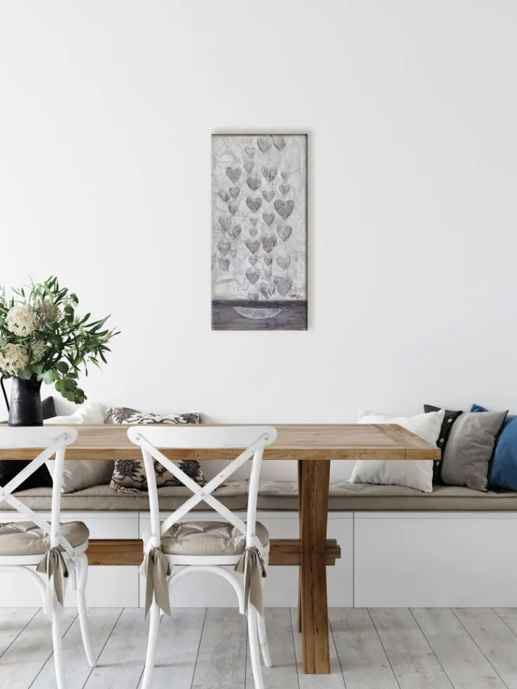 Das ästhetisch ansprechende Ölbild der Marke BÖNNINGHOFF ist in dezenten Grautönen gehalten, die dem Gemälde eine stilvolle Ausstrahlung verleihen. Es passt zu jedem Farbkonzept im Wohnzimmer, Schlafzimmer und Büro und regt zur näheren Betrachtung an. Auf dem modernen Wohnaccessoire sind zahlreiche Herzen abgebildet, von denen jedes individuell gestaltet ist. Das Bild ist auch gut als Geschenk geeignet, das von Herzen kommt.