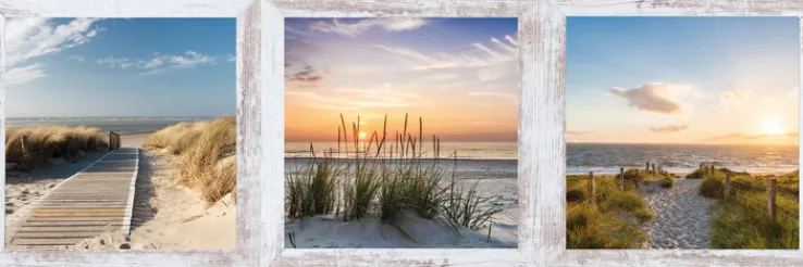 Dieses Wandbild-Set besteht aus drei quadratischen Bildern mit den Maßen 23 x 23 cm und einer Tiefe von 2,1 cm je Bild. Die Motive zeigen verschiedene Strandlandschaften, darunter einen Holzsteg, Dünen und Meer, jeweils in unterschiedlichen Lichtstimmungen vom Tageslicht bis zum Sonnenuntergang. Die Farben sind natürlich und mehrfarbig, mit dominierenden Blau-, Sand- und Grüntönen sowie warmen Sonnenfarben. Die Rahmen der Bilder sind weiß gekalkt und weisen eine sichtbare Holzstruktur auf, die den maritimen Charakter unterstreicht.