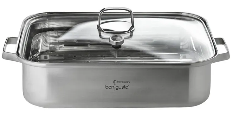 Der rechteckige bongusto Dampfgarer-Topf besteht aus einem Topf mit passendem Glasdeckel mit integriertem Thermometer und einem 35 x 10 x 25 cm großen Edelstahleinsatz. Dank Thermometer lässt sich die Temperatur im Inneren des Topfes jederzeit überwachen. Die Schlitze im Edelstahleinsatz stellen sicher, dass das Gargut ausreichend Dampf abbekommt.