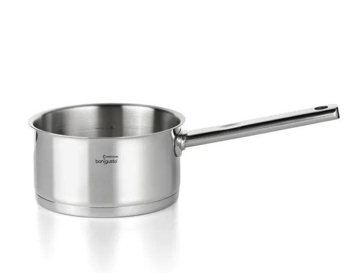 Das rostfreie Topfset von bongusto besteht aus drei Töpfen mit Deckel mit einem Fassungsvermögen von 5,3 Litern, 3 Litern sowie 1,6 Litern, jeweils mit dem passenden Deckel versehen. Eine Stielkasserole mit einem Volumen von 1,6 Litern komplettiert das Set. Alle Töpfe sind satiniert und verfügen über eine praktische Innenskalierung. Die Glasdeckel des bongusto Topfsets besitzen je eine Entlüftungsöffnung zur Dampfabgabe. Sie sind hitzebeständig bis 180 °C. Die Töpfe sogar bis zu einer Temperatur von 200 °C. Sie sind für alle Herdarten geeignet.