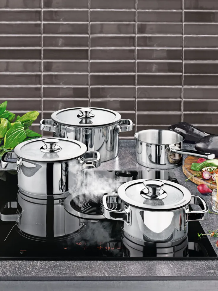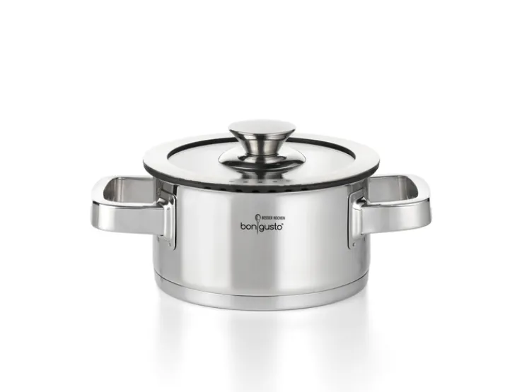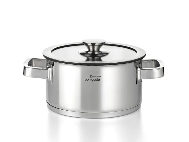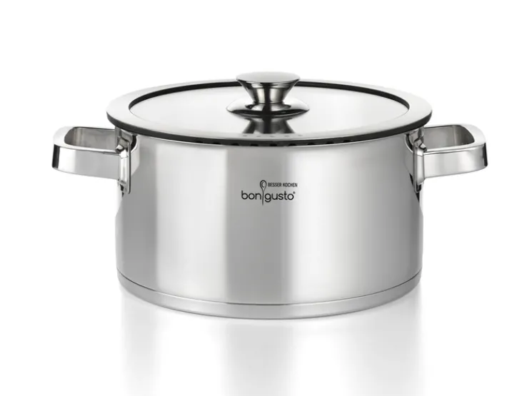 Das 4-teilige bongusto Topfset ist aus silberfarbigem Edelstahl hergestellt. Es ist induktionsfähig und mit passenden Glasdeckeln mit Silikonringen ausgestattet.