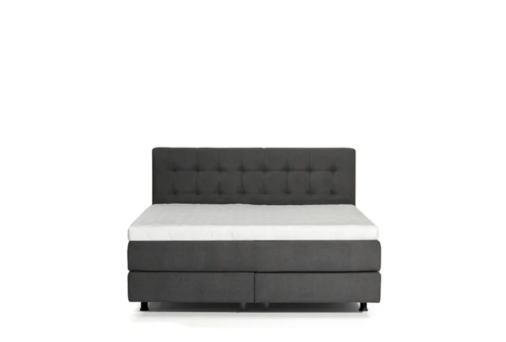 Dieses Boxspringbett aus der Serie SIENNA bietet eine Liegefläche von 180 x 200 cm und zeichnet sich durch einen Bezug in Teddy Anthrazit aus. Das gepolsterte Kopfteil ist 120 cm hoch und verfügt über eine gleichmäßige Steppung, die für eine dezente, strukturierte Optik sorgt. Die Kombination aus grauer und schwarzer Farbgebung prägt das moderne, zurückhaltende Design. Die sichtbare Textiloberfläche besteht aus 100 % Polyester-Synthetikfaser und wirkt weich sowie gleichmäßig strukturiert, während der weiße Topper einen klaren Kontrast zur dunklen Basis bildet.
