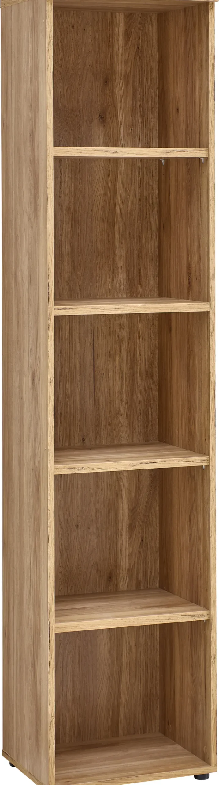 Das Büroregal aus der Serie Clyde bietet eine moderne und funktionale Lösung für Ihr Zuhause oder Büro. Mit einer Breite von 45 cm, einer Höhe von 197 cm und einer Tiefe von 38 cm passt es perfekt in verschiedene Raumkonzepte. Das Regal besteht aus mitteldichter Faserplatte (MDF) und Spanplatte, die eine robuste Holznachbildung in einem ansprechenden Mauvella-Eiche-Dekor aufweist. Die warme braune Hauptfarbe und die Eiche-Dekorfarbe verleihen dem Möbelstück eine natürliche und einladende Optik.