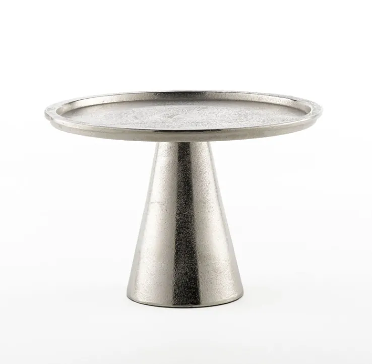Die silberfarbige Deko-Platte mit Sockel ist aus Aluminium gefertigt und hat einen Durchmesser von 27 cm. Eine ungewöhnliche Oberflächenstruktur verleiht dem exklusiven Design einen eleganten Vintage-Charme.