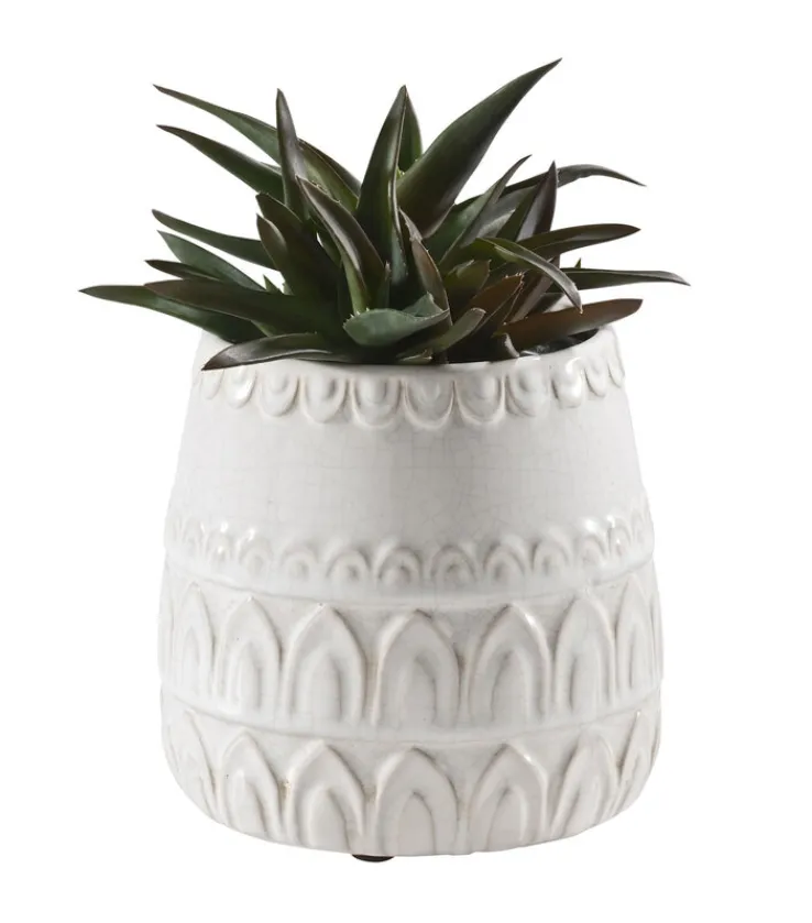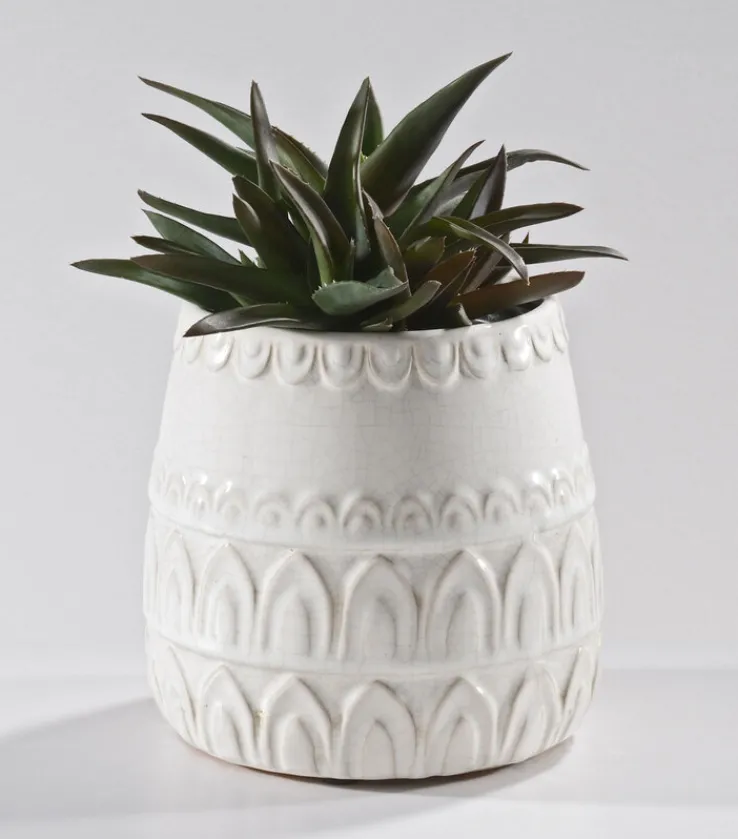 Der Topf steht auf kleinen schwarzen Füßen und schont so Ihr Mobiliar. Die bauchige Form bietet einigen Platz, der Hals ist etwas enger gearbeitet. So kommen die grünen oder bunten Pflanzen besonders gut zur Geltung, denn sie scheinen direkt aus dem Topf zu springen. Ein abstraktes und erhaben gearbeitetes Motiv schmückt die äußere Form des Übertopfes. Die Farbe Weiß harmoniert mit allen anderen Farben, sodass Sie die freie Auswahl haben, welche Pflanzen besonders gut hineinpassen.