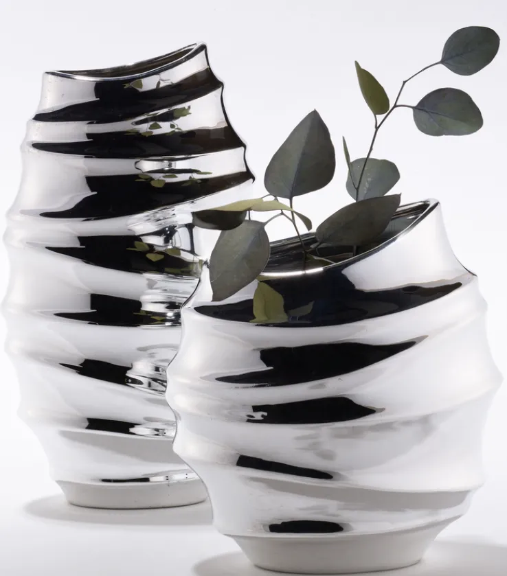 Die extravagant geformte casaNOVA Vase 35,5 cm silberfarbig Hochglanz besteht aus Kaolin und ist 21 cm breit und 12 cm tief. Ihre hochglänzende Optik verleiht ihr einen luxuriösen Charme und macht sie zum repräsentativen Blickfang.