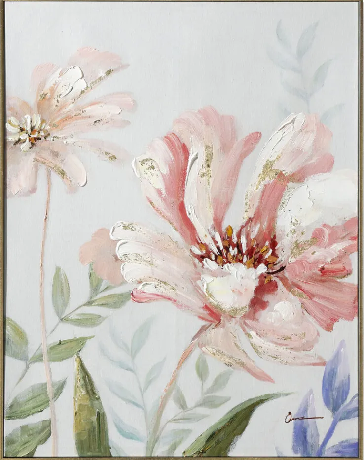 Das Bild „BLUME I“ von Casanova ist ein rechteckiges Leinwandbild, das sich durch seine harmonische Farbgebung und das florale Design auszeichnet. Die Hauptfarben sind mehrfarbig mit dominierenden Gold- und Pastelltönen, die den Blumenmotiven eine elegante und lebendige Ausstrahlung verleihen. Die Leinwandoberfläche besteht aus Textil, was dem Bild eine hochwertige Textur verleiht und die Details der Blumen besonders zur Geltung bringt.