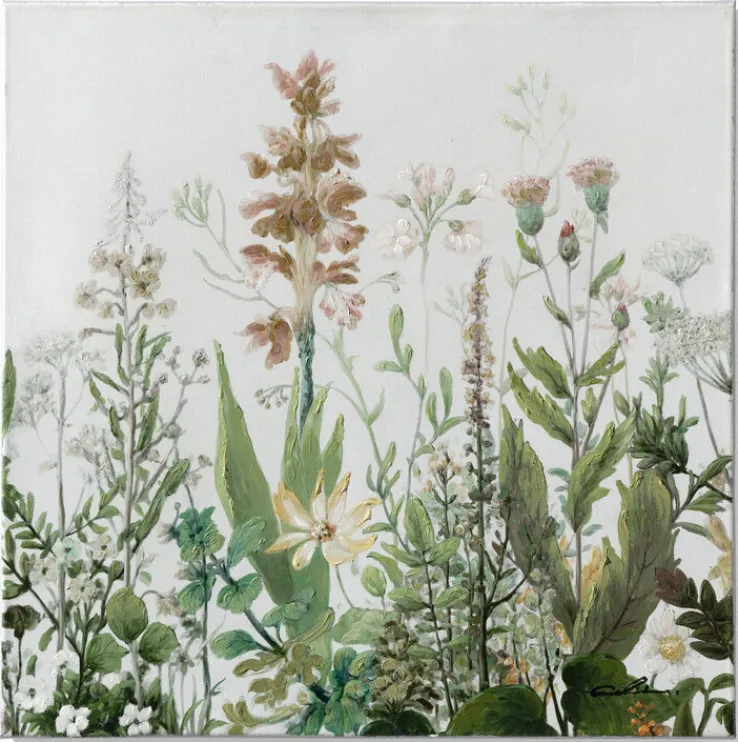 Gefertigt aus einer Kombination von Kunststoff und Textil, bietet die Leinwand eine hochwertige Textiloberfläche, die die Details der floralen Muster betont. Die harmonische Farbpalette und die detaillierte Darstellung der Pflanzen machen dieses Bild zu einem idealen Dekorationsstück für Liebhaber des Landhausstils. Es fügt sich nahtlos in verschiedene Einrichtungsstile ein und bringt einen Hauch von Natur in Ihr Zuhause.