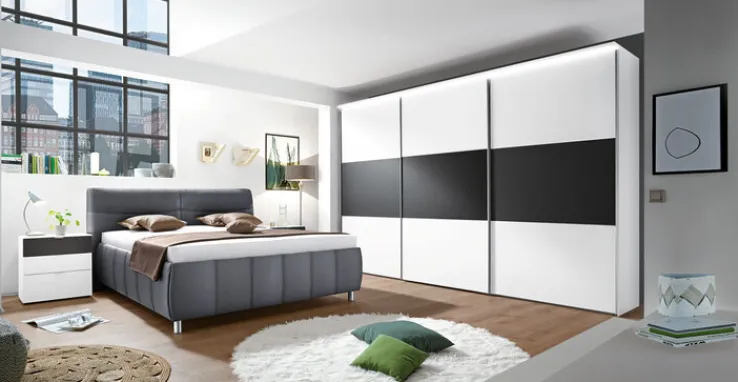 Der Kleiderschrank verfügt über drei Schwebetüren die in Weiß und Schwarz gestaltet sind. Hinter den Türen befinden sich zahlreiche Einlegeböden auf denen Ihre Klamotten schnell einen Platz finden. Auch Kleiderstangen und Schubkasteneinsätze kann dieser großzügig geschnittene Kleiderschrank vorweisen. Jede Tür ist mit einem Schließdämpfer versehen und die Griffleisten aus Alu vereinfachen das Öffnen jeder Tür.