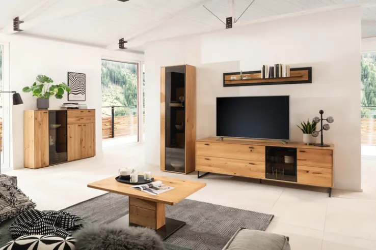 Das CASAVANTI Lowboard ASSINI kombiniert geöltes Eiche Massivholz mit Holznachbildung und einer Glastür. Hinter insgesamt zwei Türen und in zwei Schubkästen wartet das Möbelstück mit viel Platz für Alltagsgegenstände auf. Der Vitrinenteil mit zwei Fächern bietet zudem eine Besonderheit. Im Unterschied zum Rest des Möbelstücks ist das Innenleben in Anthrazit gehalten. Eine Absetzung aus Hirnholz verleiht der kleinen Vitrine eine extravagante Optik.