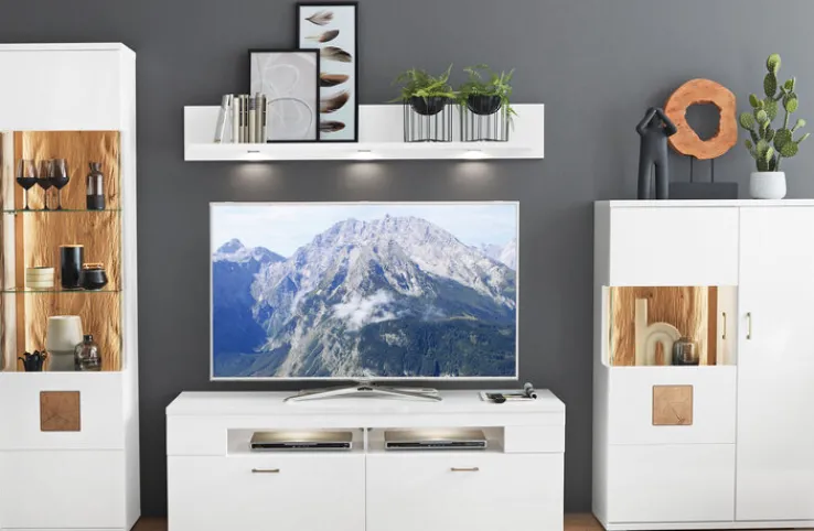 Mit der 4-teiligen CASAVANTI Wohnwand TOPEKA in Weiß/Braun kommt jede Menge Stauraum in das Wohnzimmer. Gleichzeitig begeistern die Möbel mit einem top modernen Design mit rustikalem Twist.