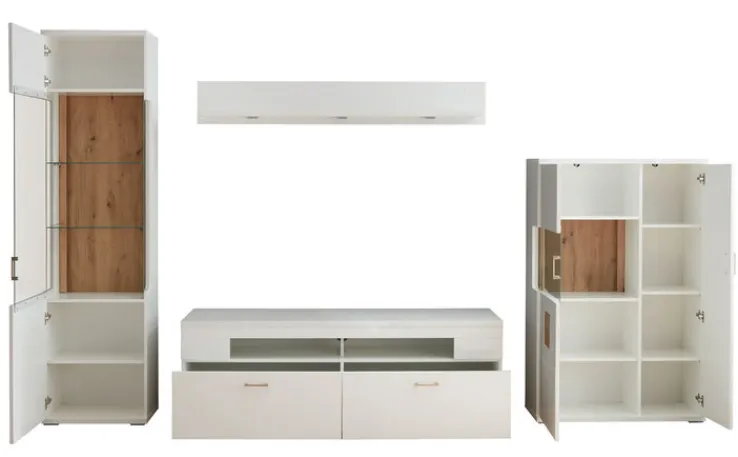 Setartikel: jaAnzahl Teile im Set: 4 Stk.Breite Setartikel 1: 55 cmHöhe Setartikel 1: 208,6 cmTiefe Setartikel 1: 37 cmSetartikel-Inhalt 1: VitrineAnzahl Setartikel-Inhalt 1: 1 Tiefe Setartikel 2: 50,2 cmBreite Setartikel 2: 165 cmHöhe Setartikel 2: 57,4 cmSetartikel-Inhalt 2: TV-LowboardAnzahl Setartikel-Inhalt 2: 1 Tiefe Setartikel 3: 26 cmBreite Setartikel 3: 160 cmHöhe Setartikel 3: 24 cmSetartikel-Inhalt 3: PaneelablagebodenAnzahl Setartikel-Inhalt 3: 1 Breite Setartikel 4: 90 cmHöhe Setartikel 4: 141,4 cmSetartikel-Inhalt 4: HighboardAnzahl Setartikel-Inhalt 4: 1 Tiefe Setartikel 4: 37,4 cmAnzahl Schubkästen inklusive: 2Anzahl Beleuchtungen inklusive: KeineAnzahl Einlegeböden inklusive: 10Anzahl Drehtüren inklusive: 5Anzahl offene Fächer inklusive: 2