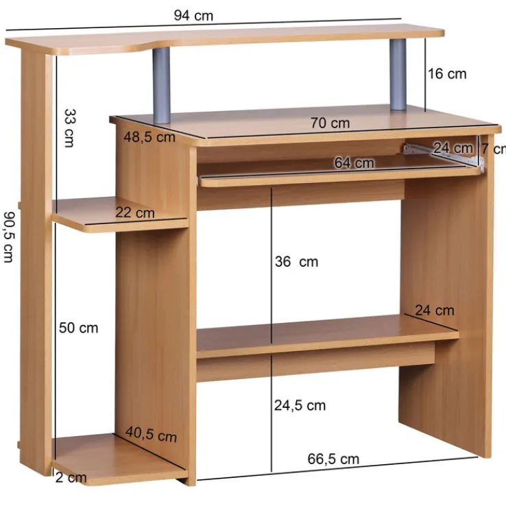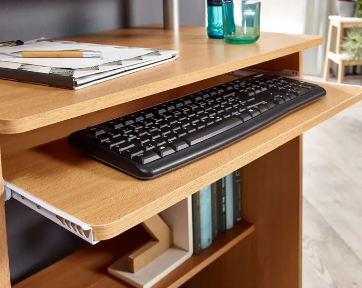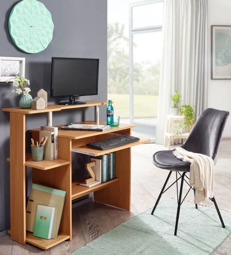 Der Computertisch besteht aus solider Holznachbildung in Buche-Dekor. Neben der geräumigen Tischplatte bietet er drei offene Ablagen sowie einen schmalen Schreibtischaufbau, der ideal für Monitor, Stifte und Dekorationen geeignet ist. Unter der Tischplatte befindet sich zudem ein Tastaturauszug. Dadurch bleibt die Oberfläche des Tisches für Arbeitsunterlagen frei. Mit seinem freundlichen Braunton harmoniert der Computertisch mit vielen Möbeln in Bucheoptik und sorgt zugleich für eine gemütliche Atmosphäre im Homeoffice.