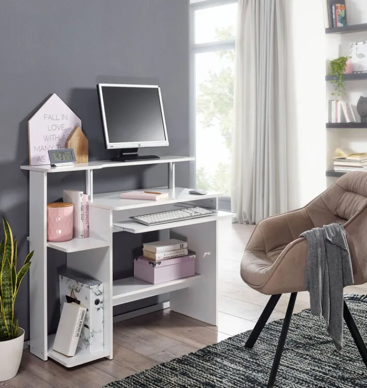 Der Computertisch 94 x 48,5 cm ist aus Spanplatten mit Oberflächen in Buchenachbildung gefertigt. Die weiße Farbgebung wirkt frisch und modern. Mit einem Tastaturauszug und drei offenen Fächern bietet er Platz zum Ablegen von Dokumenten und Arbeitsmitteln. Der Computertisch lässt sich mit einem nebelfeuchten Tuch reinigen.