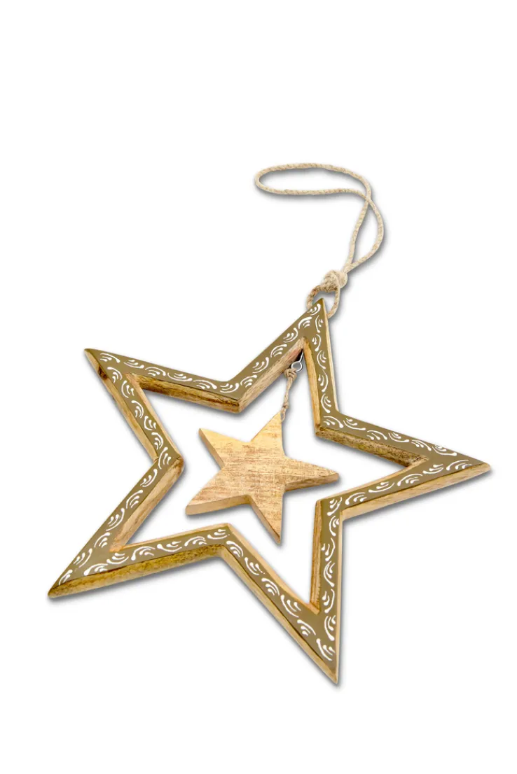 Der Deko Anhänger aus der Serie CALM & COSY besteht aus Mangoholz und ist überwiegend in Braun gehalten. Die Maße betragen 30 cm in der Breite, 29,5 cm in der Höhe und 2 cm in der Tiefe. Der Anhänger zeigt eine sternförmige Form mit einer offenen Silhouette, in deren Mitte ein kleiner, ebenfalls sternförmiger Holzeinsatz hängt. Das Holz weist eine sichtbare Maserung auf, die dem Objekt eine natürliche Optik verleiht. Die Außenseiten des Sterns sind mit weißen, dekorativen Linien und Mustern verziert, die das Design akzentuieren. Die Aufhängung erfolgt über eine beigefarbene Kordel, die bereits inklusive ist. Geeignet ist der Anhänger für den Innenbereich.