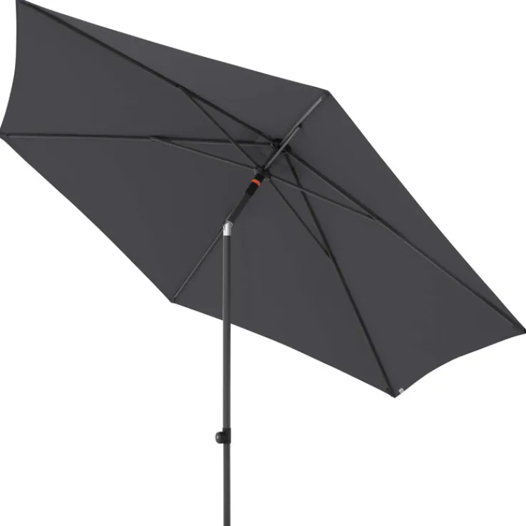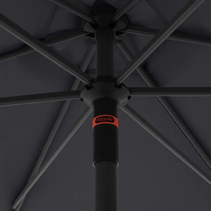 Der doppler Sonnenschirm myZONE hat einen Durchmesser von 300 cm und eine Höhe von 258 cm, die Durchgangshöhe beträgt 200 cm. Er ist aus Aluminium und Polyester in Anthrazit.