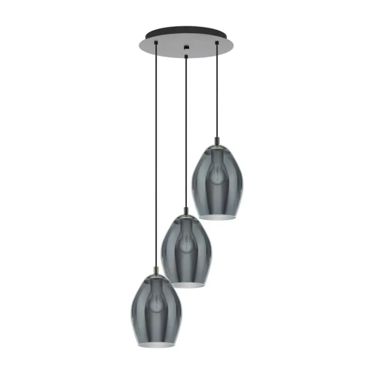 Die 3-flammige Retrofit Pendellampe ESTANYS von EGLO präsentiert sich stilvoll elegant und ist eine Bereicherung für das moderne Wohn- oder Esszimmer. Durch die konisch geformten Lampenschirme aus Glas und Metall in der Farbe grau ist die Lampe ein Blickfang über dem Couch- oder Esstisch. Mit AGL- und Retrofit-Leuchtmitteln sorgt die Deckenlampe für eine angenehme Atmosphäre.