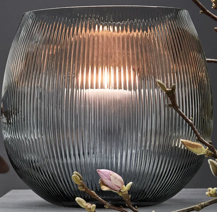 Das 26,5 cm hohe Windlicht EMMA erzeugt mit seiner bauchigen Form und der senkrecht geriffelten Struktur anmutige Lichteffekte. Das leicht transparente, graue Glas lässt sich ideal mit hohen oder niedrigen Stumpenkerzen kombinieren. Das Tanzen der Flamme über das dickwandige Glas zu beobachten führt zu Ruhe und Entspannung.