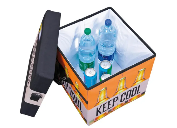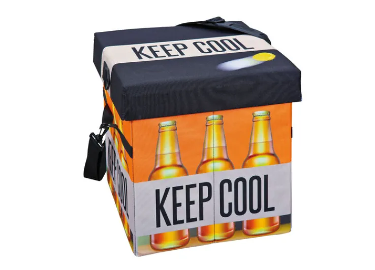 Die Faltkiste FANBOX II in den Farben Schwarz, Orange und Weiß ist eine clevere Idee, Getränke zu kühlen. Besonders praktisch: Sie lässt sich auch als Sitzhocker nutzen.