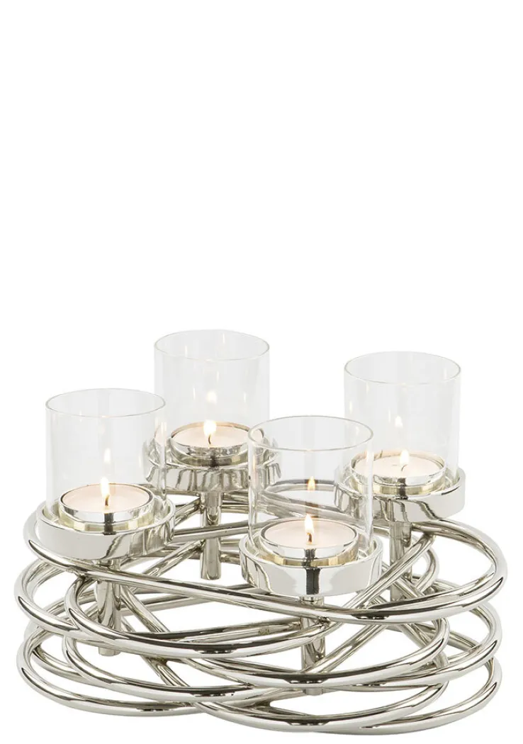 Der Fink Deko-Kranz DUPLEX besteht aus einem kunstvoll geflochtenen Metallgestell mit vier Kerzenhalter und vier Glaseinsätzen. Er lässt sich wahlweise mit Teelichtern oder Stumpenkerzen bestücken. Die Glaseinsätze schützen die Flammen vor Zugluft und unterstützen einen gleichmäßigen Abbrand. Durch das moderne und doch minimalistische Design ist der Dekokranz für jede Jahreszeit geeignet und macht auch als Adventskranz eine gute Figur. Zudem lässt er sich dem Anlass entsprechend dekorieren.