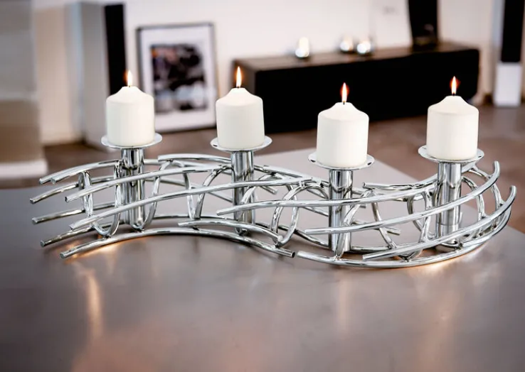 Mit seiner geschwungenen Form ist er insgesamt 80 cm lang und strahlt mit seinen silberfarbig vernickelten Oberflächen nüchterne Eleganz aus. Der Kerzenhalter kann aber längst nicht nur in der Weihnachtszeit Verwendung finden. Da die interessant aus dünnen Metallstäben zusammengesetzte Form keinen spezifischen Weihnachts- oder Winterbezug hat, kann der Kerzenhalter durchaus ganzjährig genutzt und durch verschiedene Arten von Dekoration ergänzt werden.