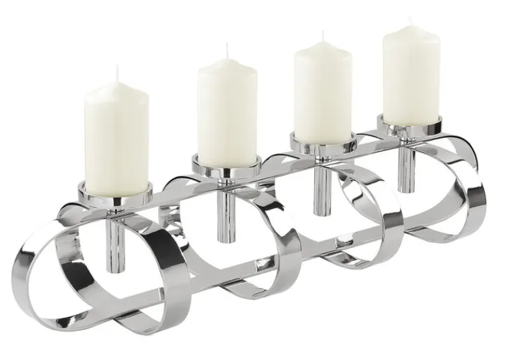 Der FINK Kerzenhalter GORDON ist 85 cm lang, 18 cm hoch und 27 cm tief. Er besteht aus Metall, das silberfarbig und vernickelt ist. Der Halter ist für 4 Kerzen geeignet. Die moderne Optik überzeugt.
