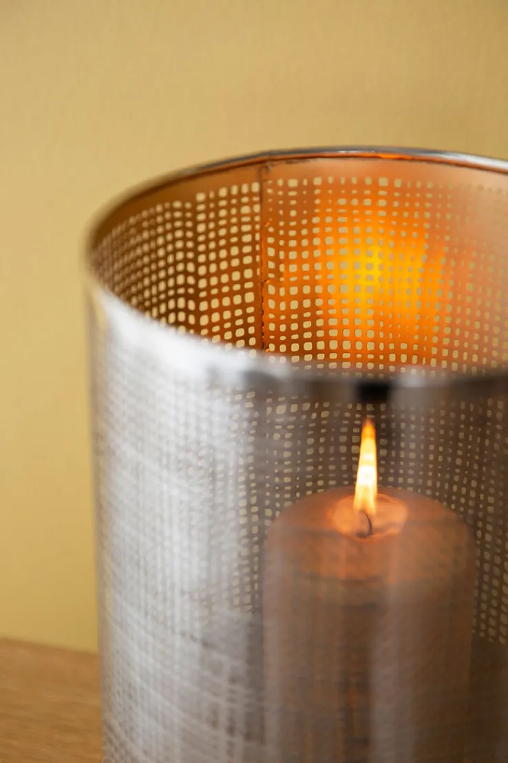 Das moderne Fink Windlicht MAURA vereint Glas und Metall. Mit der vernickelten Oberfläche, die außen in Silberfarbig gehalten ist, ist das Windlicht vielseitig kombinierbar. Die Innenseite erstrahlt in Goldfarbig, wodurch das Kerzenlicht besonders warm strahlt. Durch das schöne Lochmuster zaubert die Kerze spannende Lichtspiele an die Wände. Das edle Windlicht ist für Stumpenkerzen und Teelichter gleichermaßen geeignet und sieht auch auf der Terrasse wunderschön aus.