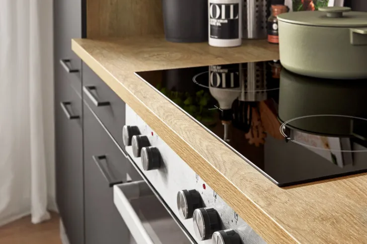 Wir stellen Ihnen die Küchenzeile MARY Touch Black/ Endgrain Oek 270 cm vor: eine perfekte Mischung aus Eleganz und Funktionalität in einem Schrankset. Die elegante, matte schwarze Farbe und das einzigartige Endgrain-Detail machen sie zu einem echten Blickfang, der jede Küche mit Raffinesse und Stil bereichert.