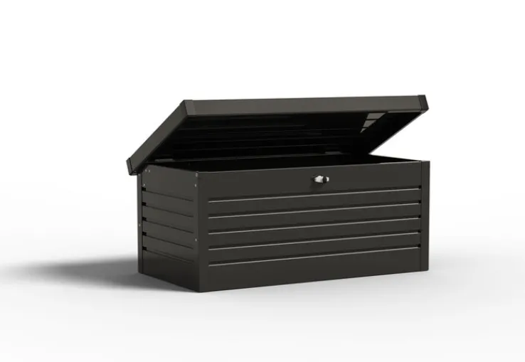 Der robuste Stahl der Auflagenbox RAY von Garden FLAIR ist gegen Korrosion geschützt. Damit ist die Lebensdauer der Auflagenbox deutlich höher. Gleichzeitig ist die Box durch die Rippenstruktur sowohl stabiler als auch leichter. Um die Auflagen im Inneren der Box noch besser gegen Feuchtigkeit zu schützen, steht die Box auf sechs gummierten Füßen. Die auf der Innenseite der bei porta erhältlichen Box angebrachten Gasdruckfeder erleichtern das Anheben des Deckels ganz enorm. Der Inhalt der Auflagenbox RAY wird durch ein Schloss mit Drehgriff gesichert.