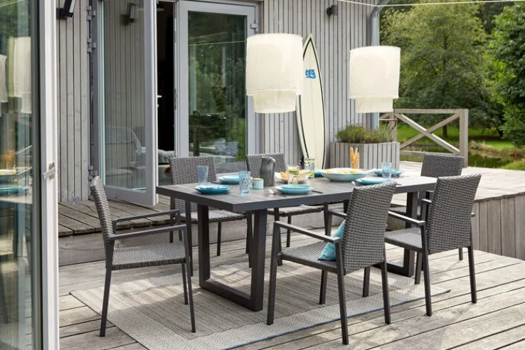 Der rechteckige Dining Gartentisch LENA kombiniert sein grau pulverbeschichtetes Kufengestell aus Aluminium mit einer eleganten Keramik-Tischplatte mit grauer Holzoptik. Mit seinem extravaganten Design avanciert der Tisch rasch zum Blickfang. Punkten kann er allerdings nicht nur optisch! An der 200 x 100 cm großen Tischplatte können bis zu 8 Personen Platz nehmen und warme Sommertage lassen sich im Kreis von Familie und Freunden genießen.