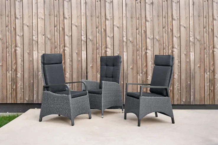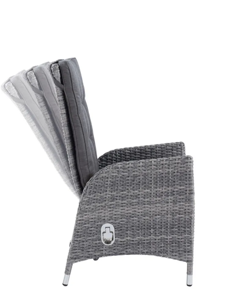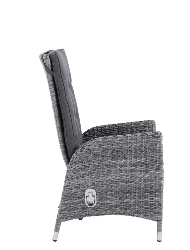 Der Garden FLAIR Positionsstuhl Garten LIANA N hat ohne Polster eine Sitzhöhe von 42,5 cm. Er ist 57 cm breit, 62 cm tief und 112 cm hoch. Er ist aus Aluminium, mit einer Geflecht-Polster-Kombination in Graumix.