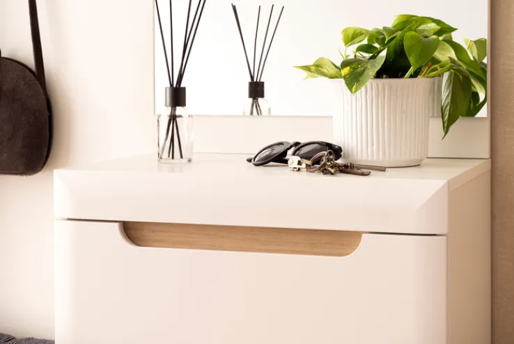 Die Hauptfarbe ist Weiß, ergänzt durch ein mattes Finish und Dekorelemente in Scandi-Oak, die dem Möbelstück eine moderne und zugleich warme Optik verleihen. Die Garderobe besteht aus einer Holznachbildung mit mitteldichter Faserplatte (MDF) und Metallhaken. Sie verfügt über drei Haken, die ideal zum Aufhängen von Jacken und Mänteln geeignet sind. Der integrierte Spiegel und die zusätzlichen Ablageflächen bieten praktische Lösungen für den täglichen Gebrauch.