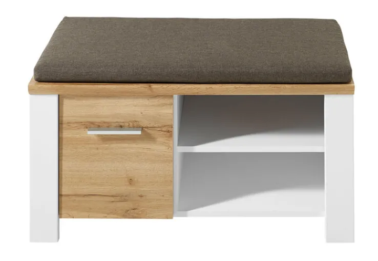 Die Garderobenbank verfügt über eine Drehtür und einen Einlegeboden, die zusätzlichen Stauraum bieten. Die Soft-Close-Funktion sorgt für ein geräuschloses Schließen der Tür. Das Sitzpolster in einem neutralen Braunton ergänzt das Design und bietet zusätzlichen Komfort. Hergestellt aus mitteldichter Faserplatte (MDF) und Kunststoff, ist die Bank robust und pflegeleicht. Dieses Möbelstück ist eine praktische und stilvolle Ergänzung für jeden Eingangsbereich.