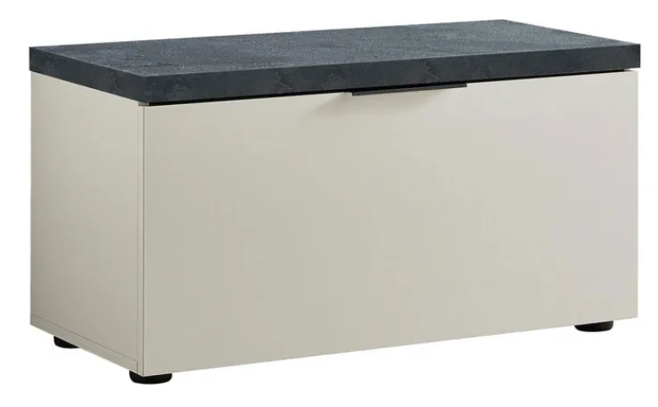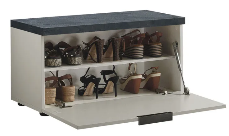 Die stilvoll gestaltete Garderobenbank REPORT in den Farben weiß Hochglanz lackiert und schiefergrau ist die praktische Ergänzung für modern eingerichtete Dielen und Flure. Durch das zeitlose und geradlinige Design ist die praktische Bank mit den Maßen 80 x 42 cm sehr gut mit modernen Garderobenmöbeln kombinierbar. Der große Innenraum für etwa 6 Paar Schuhe ist mit einer Klappe verschlossen und mit einem Fachboden unterteilt.