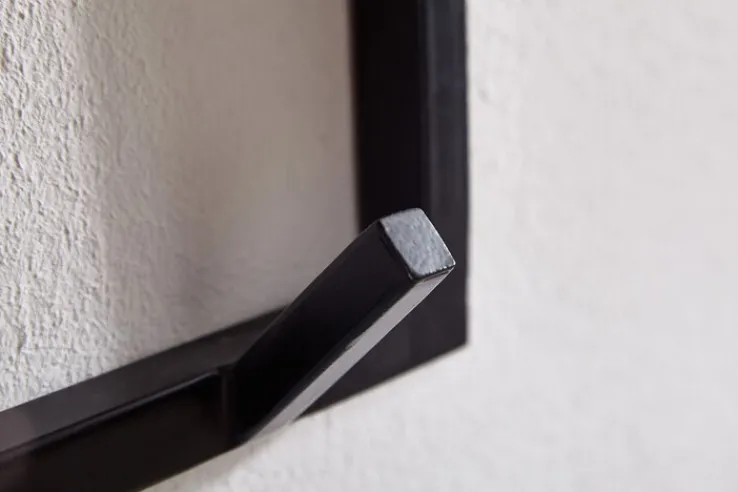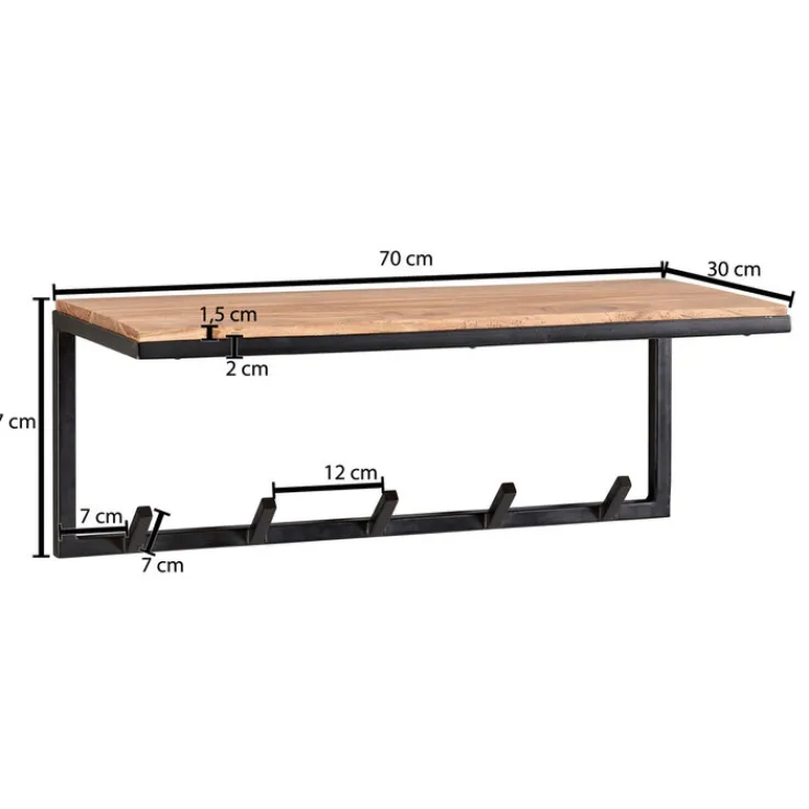 Diese Garderobenleiste misst 30 cm in der Tiefe, 70 cm in der Breite und 27 cm in der Höhe bei einem Gewicht von 5 kg und 10 kg Maximalbelastbarkeit. Sie besteht aus einem schwarzen Rahmen aus Metall in der Art von lackiertem und pulverveschichtetem Schmiedeeisen in matter Optik und einer Ablagefläche aus hellbraunem Holz in der Holzart von Akazie. Dabei kommt Massivholz zur Anwendung.