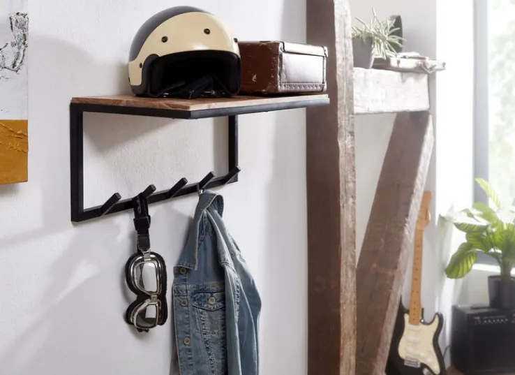 Die Garderobenleiste ergänzt sich zu einer modernen Einrichtung im Eingangsbereich, aber auch zum Skandi-Look und dem Landhausstil. Sie bringt fünf Haken für Jacken und Taschen mit, während Kleinigkeiten auf dem darüber befindlichen Regalbrett Platz finden.