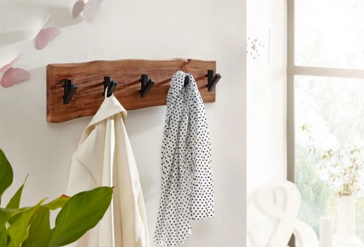Mäntel und Schals lassen sich bequem auf dem Garderobenpaneel aus Mango-Holz aufhängen. Die Maßen 60 x 17 cm bieten Platz für bis zu fünf Jacken. Ein Highlight sind die metallischen Haken, die einen idealen Kontrast zum weichen Holz bilden.