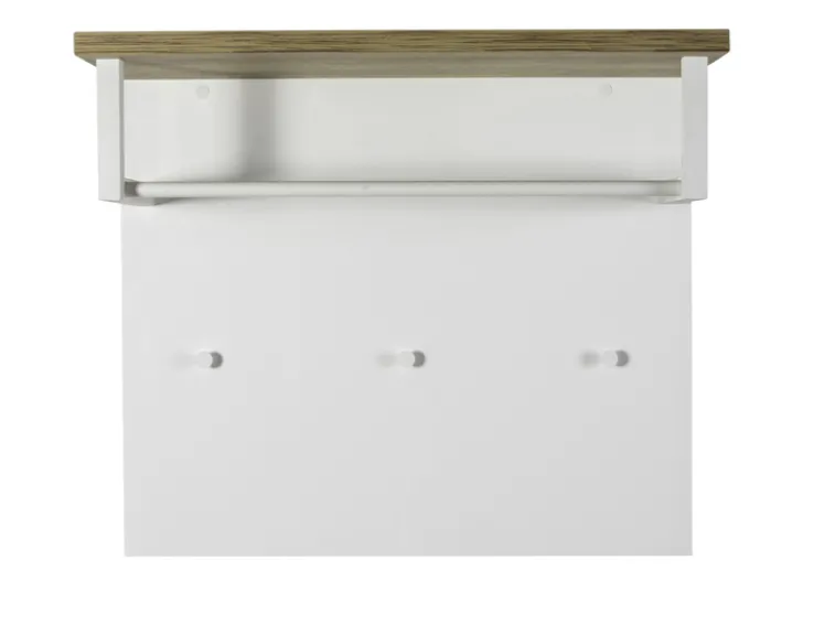 Das Garderobenpaneel MUNDI ist 83 cm breit, 35 cm tief und 71 cm hoch. Es ist aus Holznachbildung in Hochglanz mit Absetzungen in Eiche-Riviera-Dekor und verfügt über 3 Haken, 1 Kleiderstange und 1 Hutablage.