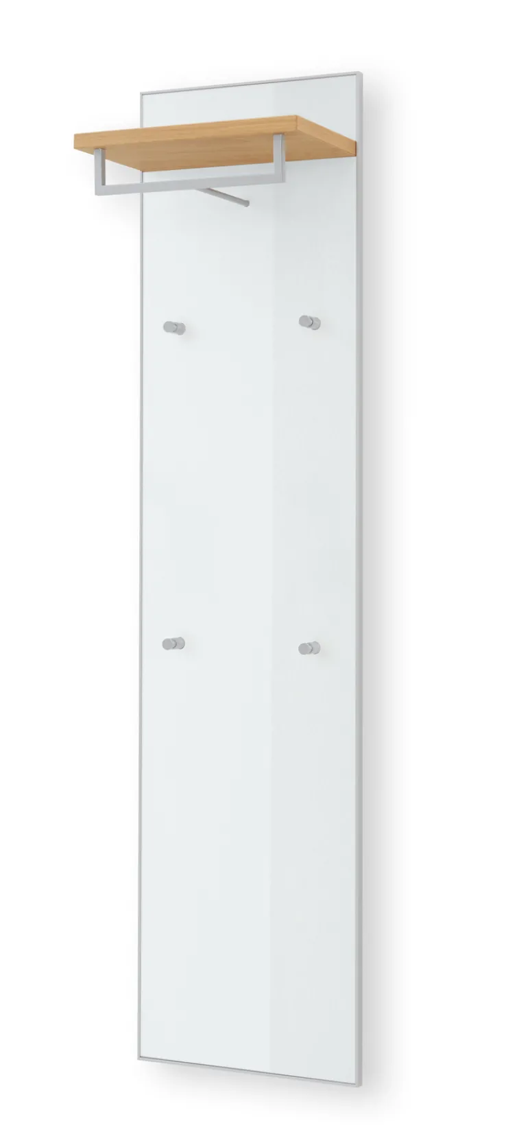 Durch die hellen Farben und das schlichte Design strahlt das Paneel puristische Eleganz aus. Es fügt sich in die verschiedensten Einrichtungen harmonisch ein. Auch unter praktischen Gesichtspunkten überzeugt das Flurmöbel auf ganzer Linie. Die Kleiderstange sowie die vier Haken bieten genügend Platz, um mehrere Jacken oder Mäntel griffbereit aufzuhängen. Insbesondere für Hüte, aber ebenso für Mützen, Caps und andere Accessoires steht oben der Ablageboden zur Verfügung.