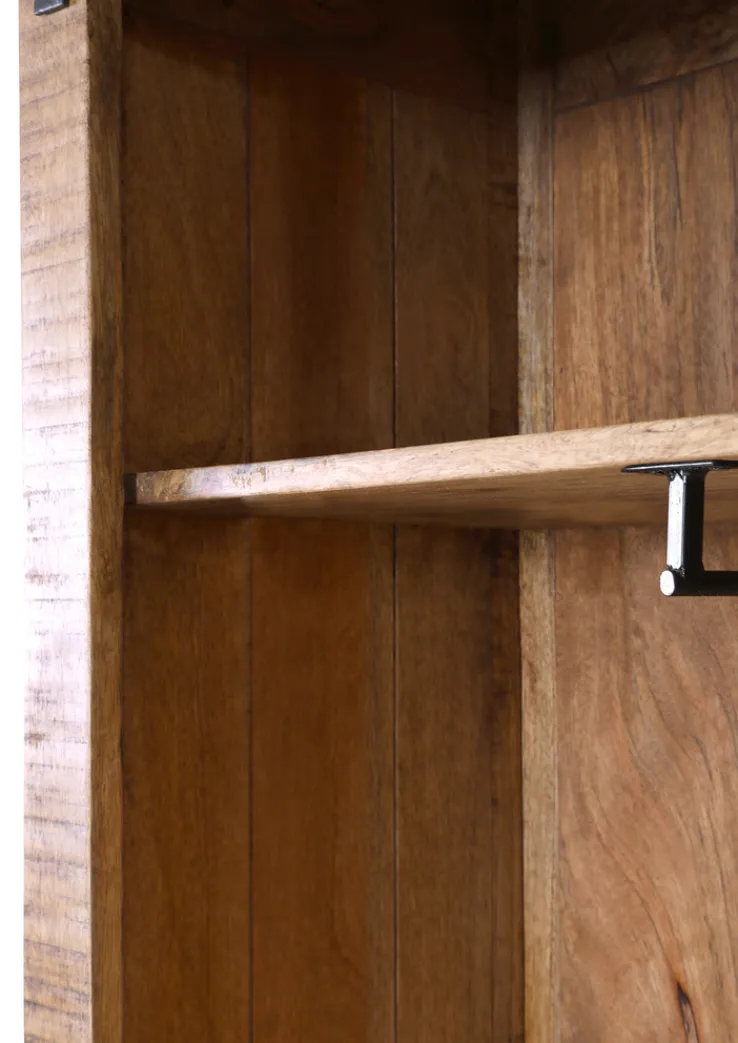 Der Schrank besteht aus massivem Mangoholz, das sägerau gebeizt und lackiert ist, was ihm eine robuste und zugleich elegante Optik verleiht. Die Hauptfarbe ist Braun, ergänzt durch schwarze Akzente, die den industriellen Charakter unterstreichen.